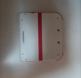 Console portatile Nintendo 2DS con un design bicolore. - Striscia centrale di colore rosso. - Due piccoli fori nella parte superiore. - Etichetta con codice a barre sul retro.