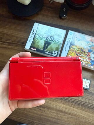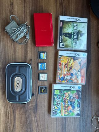 Console portatile Nintendo DS Lite in colore rosso, insieme a diversi accessori e giochi. Funziona perfettamente ma presenta graffi sul retro e una piccola macchia nera sullo schermo superiore. - Console Nintendo DS Lite - Caricabatterie - Custodia per il trasporto - Gioco: Call of Duty 4: Modern Warfare - Gioco: Inazuma Eleven - Gioco: Inazuma Eleven 2: Firestorm - scheda R4