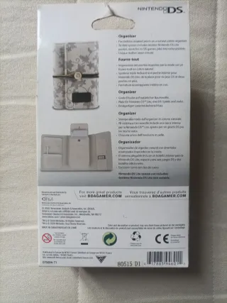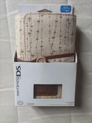 Particolare Custodia/organizer in cotone per Nintendo DS Lite. - Tessuto color crema con stampe color marrone. - Chiusura con laccio in ecopelle e bottone in legno. - Logo Nintendo DS in pelle. - Confezione originale inclusa.