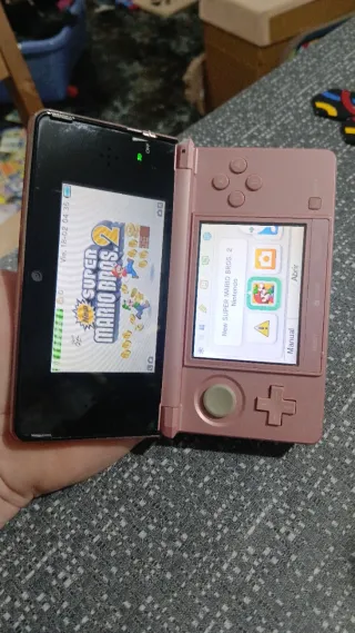 Console Nintendo 3DS in colore rosa. Buono stato di conservazione. Funziona perfettamente. Ha diversi giochi installati e possibilità di scaricare gratuitamente dalla console stessa qualsiasi gioco 3DS. Importante: l'unico difetto è che il pulsante posteriore R non funziona. Per il resto va perfettamente. Non ha molta importanza poiché è un pulsante che non si usa abitualmente per giocare. Include un caricabatterie non originale Nintendo completamente nuovo. Lo usi tu.