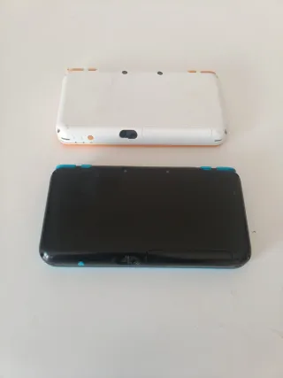 Console portatile Nintendo DSi XL in colore giallo e console Nintendo 3DS blu. Include 3 giochi (Pokemon Diamante, FIFA 15 e Brain Training). Nessun caricatore incluso per nessuna delle due.