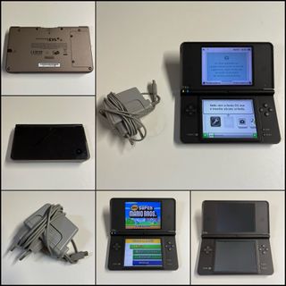 Console portatile Nintendo DSi XL in colore rosso/marrone. Include custodia protettiva. In regalo il gioco Super Mario Bros. Custodia da trasporto con scomparti interni. Spazio per cartucce di gioco.