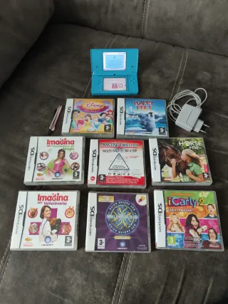 Consola portatile Nintendo DSi in colore blu, in buone condizioni, con i tipici graffi d'uso, funziona perfettamente. Include caricatore originale, stili e 9 giochi: Disney Princess: Magical Jewels, Happy Feet, Immagina di essere una Stilista di Moda, Practise English: Inglese per la vita quotidiana, My Horse and Me, Immagina di essere una Veterinaria, Chi Vuole Essere Milionario? 2ª Edizione, iCarly 2: Join the Click!, Barby the Island Princess.