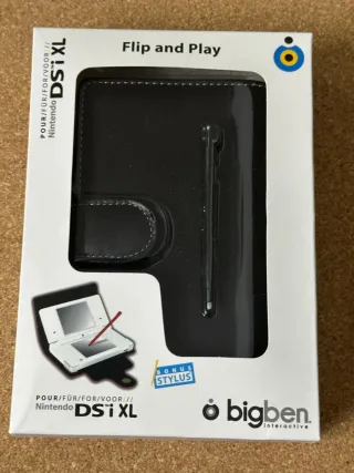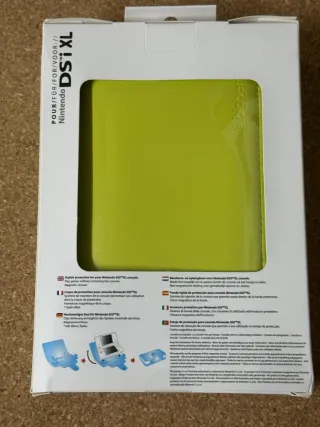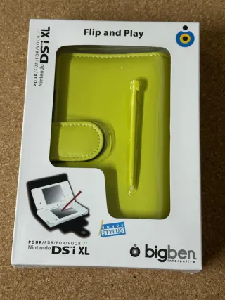 Custodia Flip and Play per Nintendo DSi XL della marca Bigben. Proteggi la tua console con stile. Colore verde lime. Include uno stilo Bonus Stylus.