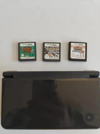 Console Nintendo DSi XL in colore nero, insieme a tre cartucce di giochi. - Pokémon Edizione Platino - Pokémon Bianco 2 - Animal Crossing: Wild World Tutto in perfette condizioni e funzionante senza alcun problema.