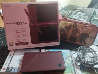 Console Nintendo DSi XL in colore ciliegio perfettamente funzionante (appena usata) + 3 giochi nella loro confezione originale con tutta la pubblicità. Include la confezione originale, 2 stili touch, una custodia di trasporto (un po' usurata) e il caricabatterie.