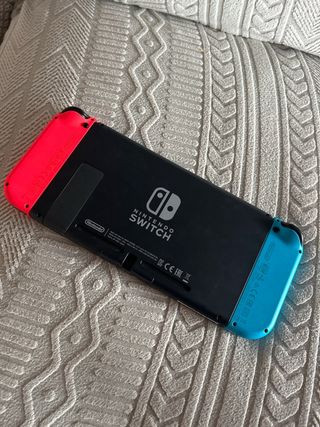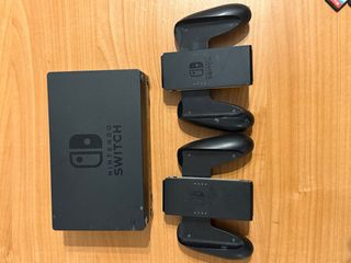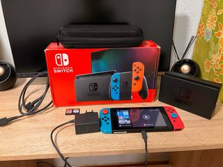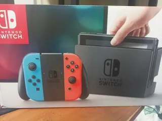 Console Nintendo Switch con accessori e due giochi. Include il controller per posizionare i Joy-Con (non visibile nell'immagine), console, Joy-Con (blu e rosso), base di ricarica. Due cartucce di gioco incluse. Funziona perfettamente ed è in ottime condizioni, con cavi originali e possibilità di connessione allo schermo. Tutto funziona perfettamente, la vendo semplicemente per mancanza di utilizzo.