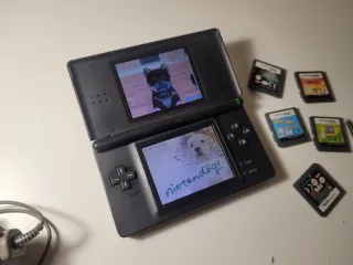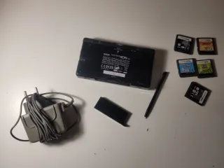 Console portatile Nintendo DS Lite in colore nero, con sei cartucce di giochi. - Gioco: Nintendogs - Gioco: FIFA 06 - Gioco: Worms - Gioco: Le cronache di Narnia - Gioco: Catz & Catz 2 - Guinness dei primati. Console in buono stato di funzionamento + caricabatterie ufficiale + stilo tattile. La Nintendo funziona normalmente, l'unico problema sono alcuni pixel sbiaditi sullo schermo. Pulsanti, batteria, suono, cerniera, schermo tattile e lettore di cartucce DS e GBA in buono stato.