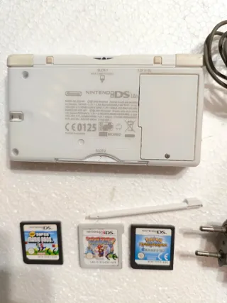 Console Nintendo DS Lite di colore bianco, completa di accessori. - Console Nintendo DS Lite - Alimentatore - Stylus - Super Mario Bros. - Mario Sticker Star - Pokémon Diamante