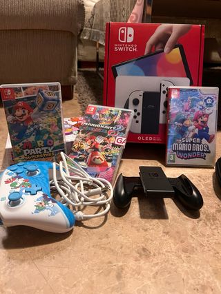 Console Nintendo Switch OLED in bianco, con vari giochi. - Mario Party Superstars - Mario Kart 8 Deluxe - Super Mario Bros. Wonder - Mando aggiuntivo per Switch