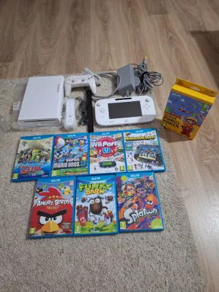 Console Nintendo Wii U in bianco, con vari giochi. Include: console Wii U senza scatola con tutti i cavi, controller Wii U, controller Pro, giochi: The Legend of Zelda, Super Mario Bros. U, Wii Party U, Nintendo Land, Super Mario Maker Collector's Edition, Angry Birds Trilogy, Funky Barn, Splatoon. Tutto in ottime condizioni con poco utilizzo. COLLEZIONE PERSONALE.