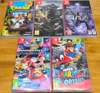 Confezione da 5 videogiochi per Nintendo Switch. - Crash Bandicoot N. Sane Trilogy - Monster Hunter Rise - Saints Row IV: Re-Elected - Mario Kart 8 Deluxe - Super Mario Odyssey