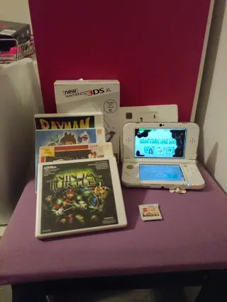 Console Nintendo 3DS XL in bianco, con cinque videogiochi inclusi: Teenage Mutant Ninja Turtles, Rayman e altri 3. Include caricabatterie e custodia trasparente. Nota: lo schermo ha alcune parti nere ma funziona perfettamente.
