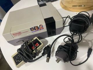 Console Nintendo NES classica in color beige, ideale per collezionisti e appassionati di videogiochi retrò. Include accessori e giochi. - Include console. - Include controller. - Include alimentatore. - Include cavo AV. - Super Mario Bros - Tetris - Word cup - Batman - Duck Tales 2 - WF