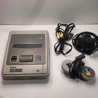 Console Super Nintendo SNES in colore beige e grigio. Include due controller, alimentatore e cavi AV. - Due controller originali. - Cavo di alimentazione. - Cavi di connessione AV. - Trasformata anche per giochi americani e giapponesi.