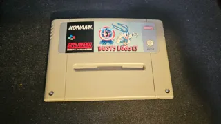 Cartuccia del videogioco Tiny Toon Buster Busts Loose per Super Nintendo. Gioco a piattaforme sviluppato da Konami.
