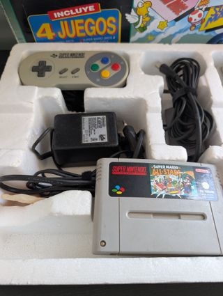 Pacchetto originale di Super Nintendo (SNES) edizione Super Mario All-Stars. Versione PAL. Include: - Console originale (modello SNSP-001A). Funziona correttamente. Ha l'ingiallimento tipico di questi plastici dovuto al tempo. - 1 Controller ufficiale Nintendo. - Cartuccia del gioco Super Mario All-Stars. - Alimentatore e cablaggio. Scatola esterna, tappi interni (polistirolo) e scheda di garanzia. La scatola esterna ha sfregamenti e usura agli angoli, ma rimane solida. I tappi sono ben conservati. Ideale per collezionisti che vogliono completare il proprio setup o giocare su hardware originale.
