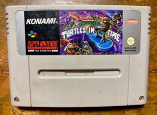 Cartuccia di gioco per Super Nintendo. Titolo: Turtles in Time. Regione: PAL. Produttore: Konami. Licenza Nintendo.