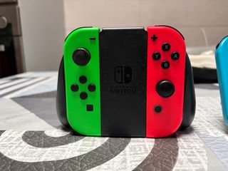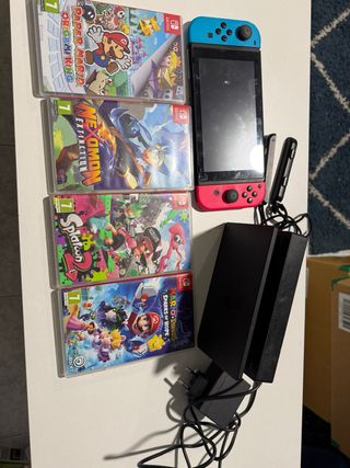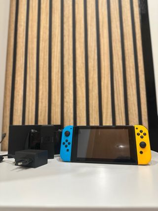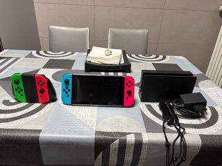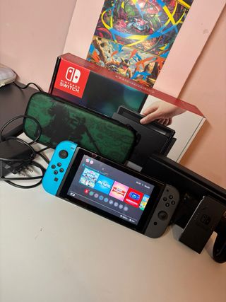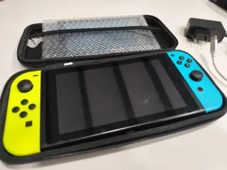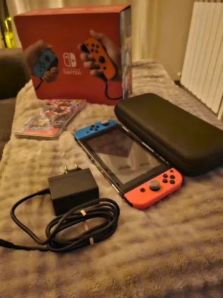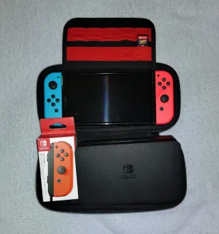 Console Nintendo Switch con accessori inclusi. Pronta per giocare, in perfette condizioni, senza problemi di drift. Conserva la sua confezione originale. - Include base di ricarica. - Joy-Cons in blu e rosso. - Custodia da trasporto nera con spazio per 8 giochi. - Cavi di ricarica e HDMI originali. - Protezioni per la console e i controller, oltre che per i joystick. - Supporto per unire i Joy-Cons e cavo di ricarica. - Domande per maggiori informazioni.