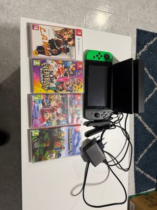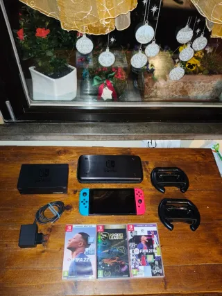 Console Nintendo Switch con vari giochi e accessori. Giochi inclusi: ARMS, Minecraft, FIFA 21, NBA 2K22, Mario deluxe 8, Mario rabbits, Minecraft, Crash Bandicoot e Starlink con i relativi accessori. Include Joy-Con wireless, Joy-Con grigio, Joy-Con sinistro, Joy-Con destro, cover per Joy-Con e Joy-Con per ogni giocatore. Schermo protettivo e joystick intercambiabile con i relativi cacciaviti. Custodia di trasporto. Supporto per la console. NON SCAMBI