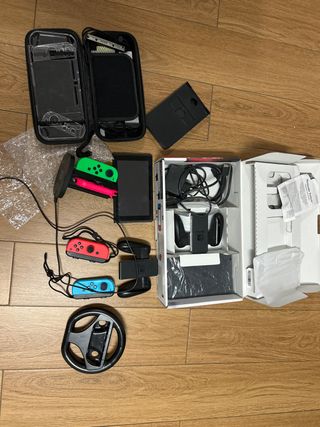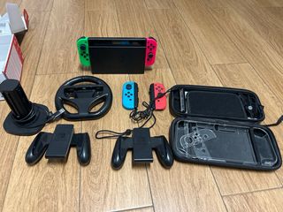 Console Nintendo Switch con accessori inclusi. Console completa con accessori: - Controller aggiuntivo - Volante - Base di ricarica per 4 controller - Custodia per il trasporto - Protezioni per la console - Include doppio controller per giocare con un'altra persona. Ideale per goderti i tuoi giochi preferiti.