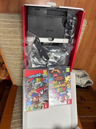 Console Nintendo Switch completa con accessori e gioco. Include console, base, controller Pro, caricabatterie e cavi. Viene con il gioco Super Mario Odyssey. Con protezione per lo schermo. Prezzo negoziabile.