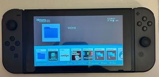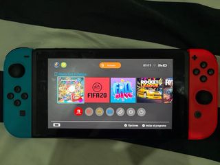 NON PREOCCUPARTI PIU' DI COMPRARE GIOCHI. SCEGLI I GIOCHI. Console Nintendo Switch con i suoi due controller. - Controller di colore blu e rosso. - Schermo touch. - Include giochi visibili sullo schermo.
