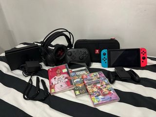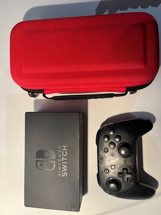 Console Nintendo Switch con accessori e gioco. Include console, base, controller Pro, caricabatterie e custodia. Gioco Super Mario Odyssey. Libro di istruzioni. Ha protezione per lo schermo. Valigetta da trasporto. Prezzo negoziabile.