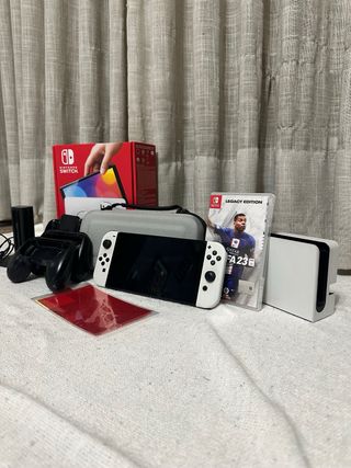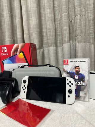 Console Nintendo Switch OLED in bianco, con vari accessori. Include custodia di trasporto, proteggi schermo, controller aggiuntivi per i Joy-Con, il gioco FIFA 23 Legacy Edition e una base di ricarica per 4 Joy-Con. Vendo per mancanza di utilizzo. Solo 15 ore di utilizzo.