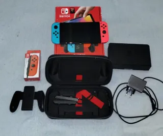 Console Nintendo Switch OLED nei colori blu e rosso. Include tutti gli accessori originali. - Base di ricarica. - Joy-Con (L) blu e Joy-Con (R) rosso. - Supporto per Joy-Con. - Cinghie per Joy-Con. - Cavo HDMI. - Adattatore di corrente. In regalo Joy-Con destro rosso extra nella sua scatola + borsa da trasporto di ottima qualità (30€) valsa la borsa.