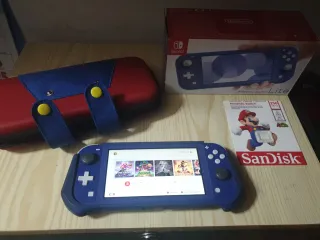 Console Nintendo Switch Lite in colore blu, con una scheda di memoria SanDisk da 256GB. Include custodia protettiva rossa e blu. Scheda SanDisk microSDXC UHS-I da 256GB. Ideale per espandere lo spazio di archiviazione dei tuoi giochi.