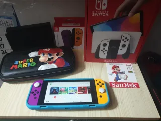 Console Nintendo Switch OLED con accessori. Include scheda di memoria SanDisk da 128GB, custodia di trasporto Super Mario, Joy-Cons nei colori viola e giallo.