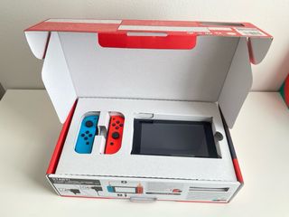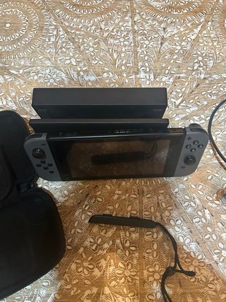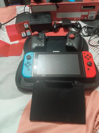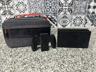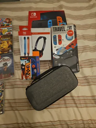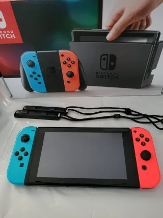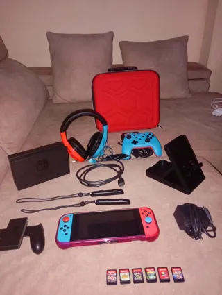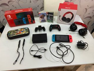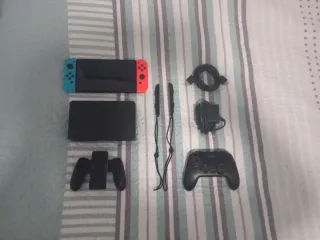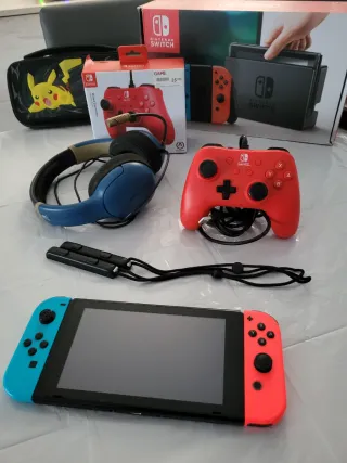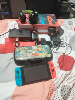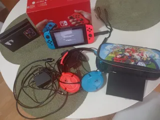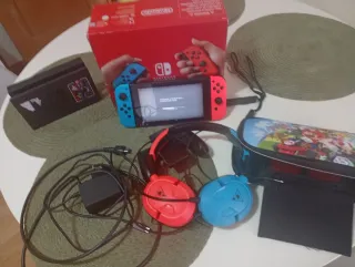 Console Nintendo Switch con accessori. Tutto in perfetto stato e nella sua scatola, praticamente nuovo. Include cuffie con microfono. Ho notato che in modalità manuale uno dei joystick può rimanere bloccato in alcuni momenti ma non ne impedisce il funzionamento. Adattatore di corrente.