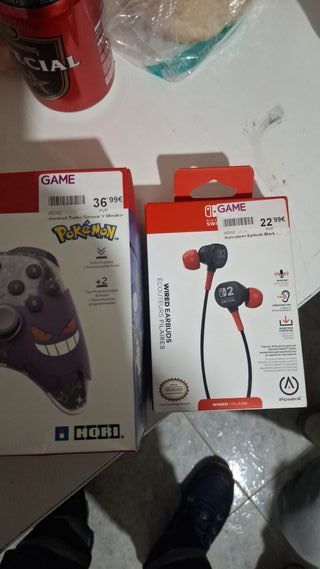 Pacchetto di accessori per Nintendo Switch. - Controller HORI edizione Pokémon. - Cuffie wireless Wired Earbuds di PowerA.