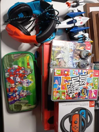 Console Nintendo Switch OLED in perfetto stato, pronta per essere utilizzata. Include accessori da viaggio e giochi. - Custodia da trasporto. - Cuffie. - Set di controller. - Giochi: Mario, Rayman, Zorro Chronicles, Dragon Ball Z.