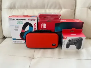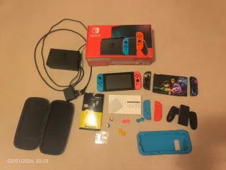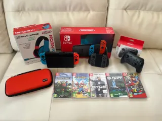 Pacchetto completo di Nintendo Switch con accessori. - Console Nintendo Switch. - Base di ricarica. - Joy-Con (blu e rosso). - Supporto per Joy-Con. - Cuffie. - 2 custodie di trasporto. - 2 Protezioni per lo schermo. - Caricatore. - Controller hori (come nuovi). - Protezione Nintendo Switch trasparente per console e Joy-Con. - Scatole di tutto in perfetto stato.