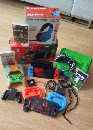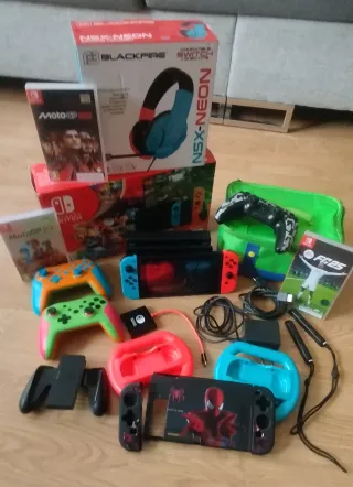 Lotteria di accessori e giochi per Nintendo Switch. - Console Nintendo Switch. - Cuffie da gioco Blackfire NSX-NEON. - Gioco MotoGP 23. - Gioco MotoGP 25. - Gioco Mario Kart 8. I primi tre giochi sono scaricati sulla console. - Gioco FC 25. Da carta. - Controller Pro. - Altri due controller, uno arancione e uno verde. Funzionano bene. - Controller Joy-Con. - Volante per giochi di corse. - Custodia di trasporto verde. - Cover protettiva Spiderman. - Connettore piccolo per il viaggio. - Con scatola originale. È in ottime condizioni.