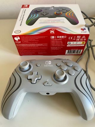 Controller cablato PDP Afterglow Wave per Nintendo Switch in colore grigio. - Controller cablato con ingresso audio per cuffie. - Illuminazione RGB variabile. Venduto nella sua confezione. La confezione ha un piccolo strappo. Vedi l'ultima foto.