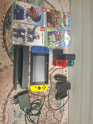Console Nintendo Switch con accessori e giochi. Perfetta, senza graffi sullo schermo. Utilizzata pochissimo... - Include custodia di trasporto. - Custodia per i giochi. - Joy-Con in blu e rosso. - Base di ricarica per Joy-Con. - Protezione schermo trasparente. - Protezione rigida trasparente per l'intera console. - Giochi: Minecraft, FIFA 23, Monster Hunter Rise. - Controller extra.