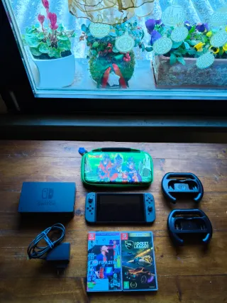 Console Nintendo Switch con tutti gli accessori e i giochi. Tutto come nuovo tranne la Switch che ha delle righe sullo schermo ma funziona perfettamente e i controller sono nuovi. - Include controller aggiuntivi. - Giochi: Super Mario Odyssey, Pokémon Spada, Pokémon Eevee. - Gioco FIFA 22 e Mario+Rabbids senza scatola. - Custodia da trasporto Zelda.