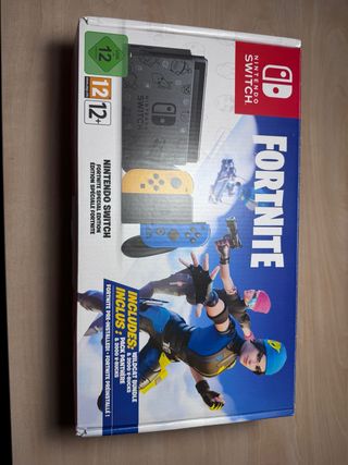 Consola Nintendo Switch con design speciale di Fortnite. Include Joy-Con in colori blu e giallo. Design tematico di Fortnite sul retro della console. Codice già riscattato. Con scatola. Senza il controller per posizionare i Joy-Con e senza caricatore.