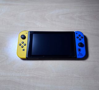 Console Nintendo Switch con il gioco Fortnite preinstallato. Include un gioco fisico di Pokémon, Splatoon 2, tutti gli accessori e la confezione originale. Colore rosso e blu.