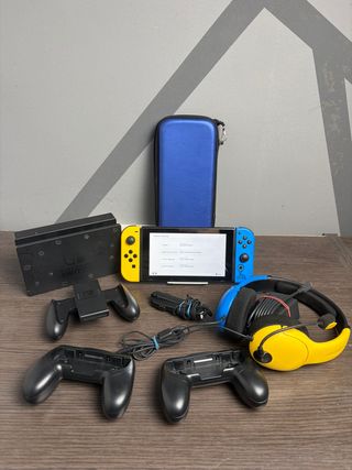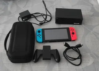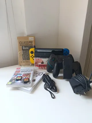 Console Nintendo Switch con tutti gli accessori. ✅️ Caricatore originale ✅️ Include base di ricarica originale con hdmi. ✅️ 3 set di controller ✔️ I neri sono per i gamer, con Joy-Con migliorati per funzionare perfettamente con giochi di tipo PvP come Fortnite. Questi non hanno carica esterna, funzionano solo collegati alla Nintendo. ✅️ Cavo hdmi originale Nintendo per collegare alla televisione e renderlo più facile da trasportare ✅️ Sono inclusi i giochi Nintendo più famosi La protezione ha delle crepe ma lo schermo è in perfette condizioni, è stato curato con molta attenzione. Funziona perfettamente. Senza giochi 200€. Ho la scatola originale.