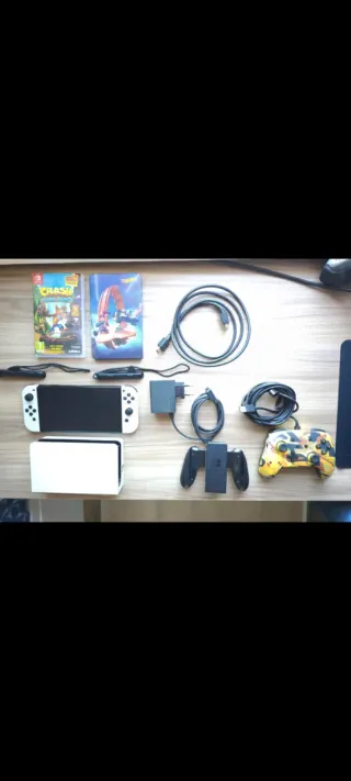 In vendita Nintendo Switch Oled con custodia Mario Kart, gioco Crash Bandicoot, Hot Wheels, controller Nintendo, controller Pikachu, caricabatterie, cavo HDMI e base.
