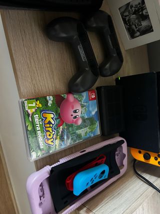 Pacchetto Nintendo Switch con il gioco Kirby e la Terra Dimenticata e accessori. - Gioco Kirby e la Terra Dimenticata per Nintendo Switch. - Due grips per Joy-Con. - Custodia protettiva per la console. *Manca un joy-con come si può vedere e si è visto che si possono acquistare separatamente. Lo schermo ha 1 anno e l'altro joy-con funziona.