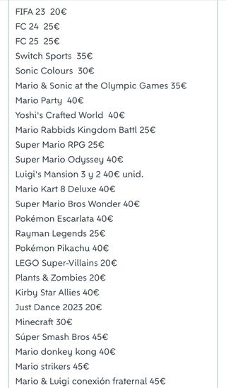 Non abbassiamo i prezzi. Lista dei giochi per Nintendo Switch disponibili. FIFA 23, FC 24, FC 25, Switch Sports, Sonic Colours, Mario & Sonic at the Olympic Games, Mario Party, Yoshi's Crafted World, Mario Rabbids Kingdom Battl, Super Mario RPG, Super Mario Odyssey, Luigi's Mansion 3 e 2, Mario Kart 8 Deluxe, Super Mario Bros Wonder, Pokémon Escarlata, Rayman Legends, Pokémon Pikachu, LEGO Super-Villains, Plants & Zombies, Kirby Star Allies, Just Dance 2023, Minecraft, Súper Smash Bros, Mario donkey kong, Mario strikers, Mario & Luigi conexión fraternal.