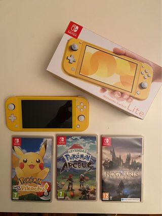Consola Nintendo Switch Lite in colore giallo, insieme a tre videogiochi. - Nintendo Switch Lite (Gialla) - Hogwarts Legacy - Pokémon Legends: Arceus - Pokémon: Catturali! Pikachu - Caricatore Nintendo Switch Lite