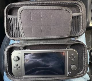 Console Nintendo Switch Lite in colore grigio. Si trova all'interno della sua custodia protettiva. Include: - Custodia di trasporto - Caricatore originale - Scheda esterna per maggiore capacità