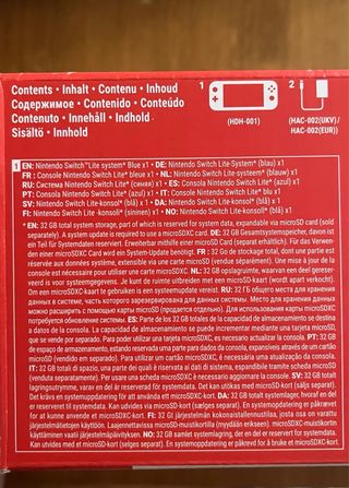 Console Nintendo Switch Lite in colore blu. Modello HDH-001. Prodotto in Cina.