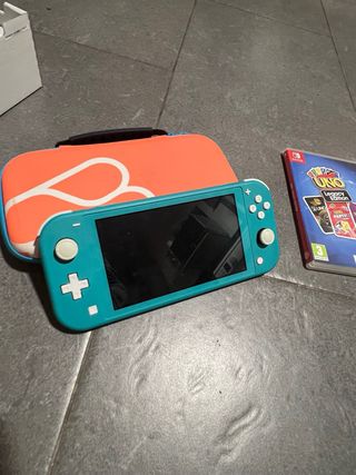 Console Nintendo Switch Lite in colore blu, poco usata. Include custodia arancione. - Gioco: Mario Kart 8 Deluxe. - Gioco: UNO Legacy Edition.